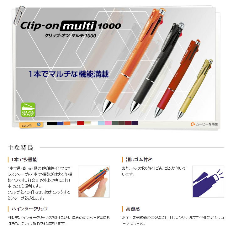 説明 :商品説明 ZEBRA/クリップ-オン マルチ1000(B4SA2) ■ 1本で多機能 1本で黒・青・赤・緑の4色油性インクにプラスシャープの1本で5機能が使える多機能ペンです。打合せや外出の時にこれ1本でとても便利です。 クリップをスライドさせ、続けてノックするとシャープ芯が出ます。 ■ 消しゴム付き また、ノック部の後ろに消しゴムが付いています。 ■ バインダークリップ 可動式金属バインダークリップの採用により、厚みのあるボード等にもはさめ、クリップ折れを軽減させます。 ■ 高級感 ボディは高級感のある塗装仕上げ。グリップはすべりにくいシリコーンラバー製。 多機能油性ボールペン/複合筆記具/クリップオンマルチ/多機能ペン 商品仕様 芯径 0.7mm サイズ 軸径14.0×全長148.5mm 重量 24.9g インキ色 黒・青・赤・緑 備考 シリーコンラバーグリップ付き 替芯 SK-0.7芯 シャープ径 0.5mm 替消しゴム J 品番 軸色 品番 JANコード 黒 B4SA4-BK 4901681147410 青 B4SA4-BL 4901681147427 赤 B4SA4-R 4901681147434 銀 B4SA4-S 4901681147472
